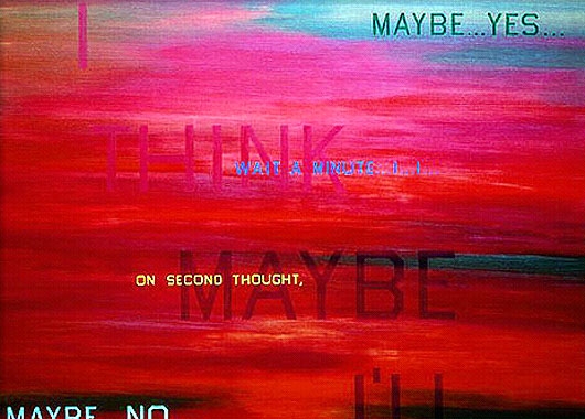-También se han incluido pinceladas joviales y frescas, como la del artista californiano Edward Ruscha y su pintura “I think I’ll…” una metáfora de la indecisión que nos rodea todos los días. La obra representa una brillante puesta de sol rojiza rodeada de frases como Quizás…sí… y Quizás… No….