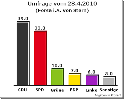 Analizando los resultados de los votos secundarios a las listas cerradas, la CDU perdió de media 5 puntos más que en los votos primarios a los candidatos. Teniendo en cuenta las encuestas más recientes, destaca que hace dos meses RÁ¼ttgers aún contaba con un 41% de la intención de voto, mientras que ahora sólo llegó al 34,5%. Está clarísimo que los votantes han querido castigar a la política nacional de Merkel, la concesión de ayudas a Grecia a costa de los contribuyentes alemanes. Para colmo, siendo el 9 de mayo el aniversario de la capitulación de Alemania al final de la II Guerra Mundial, Merkel no tuvo mejor ocurrencia que acudir a Moscú para presenciar el desfile anual de la vicoria sobre Alemania. Seguramente se trata de cuestiones que pesan en la decisión de voto. Foto: Pinkwart (FDP)