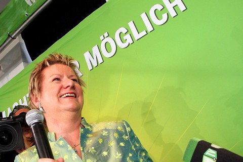 Los Verdes con los grandes ganadores de la noche al duplicar sus resultados anteriores. Por lo que dicen los comentaristas, es el único partido que ha hecho una campaña programática de contenidos, algo que los demás partidos no parecen saber hacer. Los Verdes dan por hecho una coalición con los socialistas, aunque hay sectores que no descartan acuerdos con la CDU. Su candidata LÁ¶hrmann ha sido la más radiante de la noche. Foto: LÁ¶rmann (Verdes)