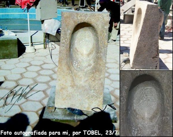 La talla que asemeja la huella de un dedo que se hunde en la piedra cual si fuera un bloque de arcilla. Está abultado por detrás como si lo hubiese arrestado la porción hacia afuera. Dicho de otra manera, como si un dedo gigante hubiese apretado hasta hundirlo, al trozo de mármol Travertino (Travertino o Sinter. Es la denominación de una roca sedimentaria y que es utilizada ampliamente como piedra ornamental en construcción, tanto de exterior como de interior).