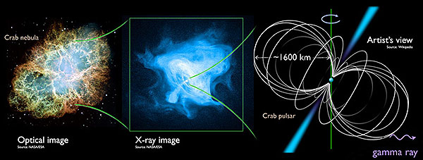 La Nebulosa del Cangrejo es una masa de gas de unos seis años luz de tamaño, resultante tras una supernova documentada en el año 1.054, que se encuentra a unos 6.500 años luz de la Tierra, en la constelación de Tauro. El núcleo de la estrella que murió en aquella fecha es hoy un púlsar, es decir, una estrella de neutrones que emite radiación periódica (de ahí su nombre), con una masa similar a la de nuestro Sol pero concentrada en no más que unos pocos kilómetros de radio y una velocidad de giro de treinta vueltas por segundo, logrando generar un campo magnético de unos cien millones de teslas.