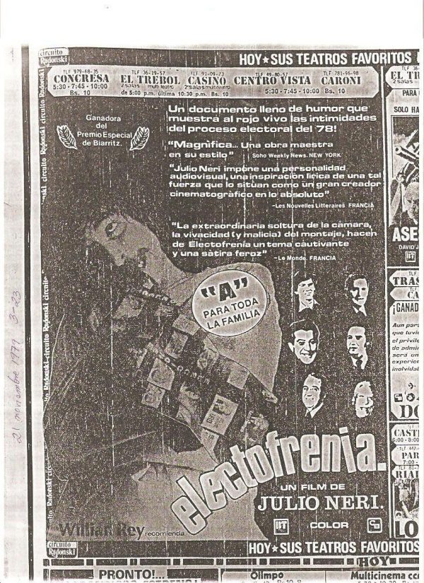 Algunos detalles sobre Electofrenia. Se estrenó el 21 de noviembre de 1979 en el ya desaparecido Teatro Caroní de Caracas. Obtuvo el Premio Especial del Jurado en Biarritz, Francia, y una mención especial en Cartagena, Colombia (1979). El diario español El País escribió: “A pesar de no cuadrar verdaderamente en la estructura del festival, Electofrenia, del venezolano Julio Neri, fue distinguida con una mención especial por su originalidad y humor en presentar con testimonios la última campaña electoral venezolana” (Triunfo del cine latinoamericano en el Festival de Biarritz, 1979). Electofrenia es un modo de resumir las palabras Esquizofrenia Electoral. Fue filmada en S8 durante 8 meses (mayo a diciembre), correspondientes al período de duración de la campaña electoral presidencial de 1978.