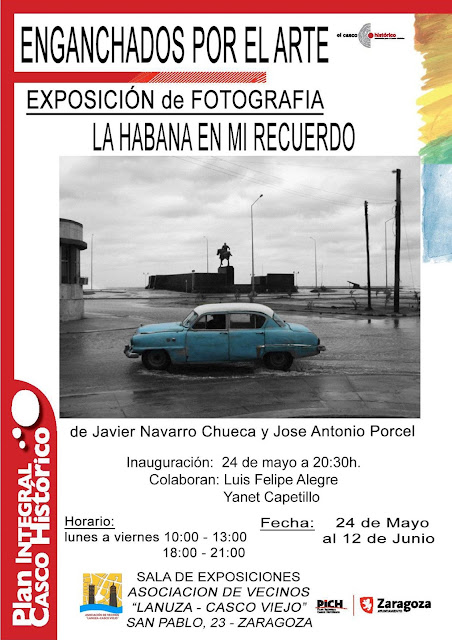 Caminar por la calle de San Pablo es caminar por la Zaragoza antigua y campesina; también es aspirar los olores que exhala el crisol de razas que en la actualidad la habita. La altiva torre mudéjar de la iglesia parroquial de San Pablo nos saluda recogiendo los últimos rayos de un sol que agoniza mansamente. Estamos llegando al local de la Asociación de Vecinos “Lanuza- Casco Viejo” en cuya sala de exposiciones esta tarde, casi noche, nuestros amigos Javier Navarro Chueca y Jose Antonio Porcel presentan sus fotografías con el título de *La Habana en mi recuerdo*. Hombres sabios, han organizado una velada cubana con manís, bananas fritas y mojitos. Como en cualquier corrala de las viejas casonas neocoloniales del Vedado o Habana Vieja.