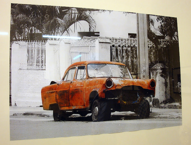 Las obras de Navarro Chueca recogen instantáneas recogidas en el antaño barrio señorial, al que llaman el Vedado. Son fotografías en blanco y negro en el que aparecen contundentes mensajes en color en forma de automóvil o vehículo que dan muestra del humor y sentido práctico que aplican los habaneros a esos supervivientes antediluvianos a los que llaman “carros”. El fotógrafo propone un viaje al pasado sin abandonar el presente y sus paisajes ciudadanos son los telones de la estrella de esta serie: los coches americanos de los años cuarenta y cincuenta que circulan, son reparados o simplemente mueren al compás cadencioso del óxido. Pero no olvidemos los fondos en las que aparecen vestigios de la arquitectura que nació de la opulencia de una ciudad que es en sí misma un completo cosmos. Navarro evoca sus recuerdos que le enfrentan al Recuerdo al que sus escenarios le remontan.
