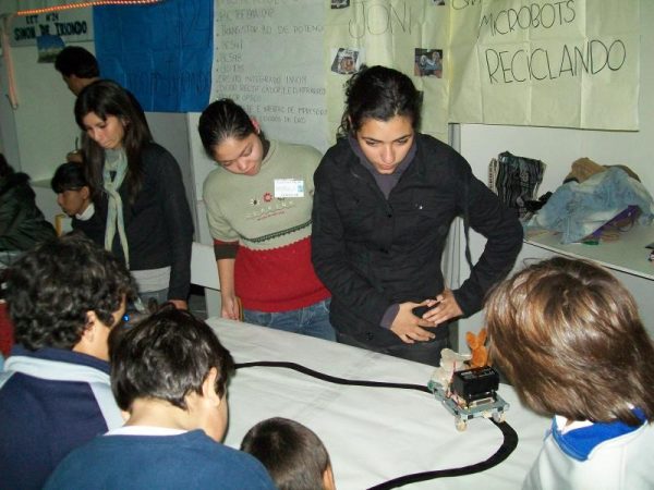 Un sendero  de micro espacios con alumnos explicando sobre métodos y herramientas diversas de aéreas desde la mecánica hasta la explotación avícola, pasando por todos los rubros tecnológicos, pero lo que más atraía a los visitantes era los micros robots. Con infinita paciencia las jóvenes expositoras del 3º 1ª C.S.I.P.P del colegio E.E.T nº 24 Simón de Iriondo,  supervisados por un profesor me introdujeron con palabras simples en el mundo complejo de esta tecnología; aplicaban los conocimientos de forma sorprendente, usan componentes electrónicos rescatados de los elementos de rezago. El taller básicamente se nutre de artefactos domiciliarios enviados para el reciclado, los desechados, dicho de otra forma ‘tirados a la basura’  de allí extraen los elementos y forman muchos pequeños aparatos robotizados en la práctica de sus enseñanzas con ínfimos recursos.