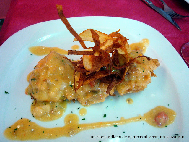 Merluza rellena de gambas con salsa de vermuth al Azafrán.