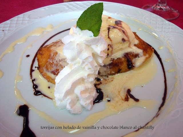 Torrijas de pan de leche con helado de vainilla y chocolate blanco.