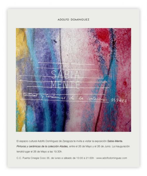 Desde el jueves 26 de mayo, se presenta al público de Zaragoza la exposición “SABIA MENTE. Pinturas y cerámicas de la colección ATADES” en la sala del Espacio Cultural Adolfo Dominguez. Las obras expuestas son el resultado de la labor en los talleres de pintura y cerámica de los centros de tutela de esta asociación por parte de los alumnos usuarios y en la que se pueden contemplar sorprendentes obras de arte realizadas por estos artistas autodidactas, que entran de lleno en la tendencia del Arte Outsider. La muestra es un compendio espectacular de color y forma, que bien podrían parecernos haber sido creadas por reconocidos artistas contempóraneos. Hasta el 26 de junio puede ser visitada en horario de 10 a 21. El E.C.A.D. está situado en la planta inferior de la boutique de A.D. en Puerta Cinegia, Plaza España. Altamente recomendada para los aficionados al arte.