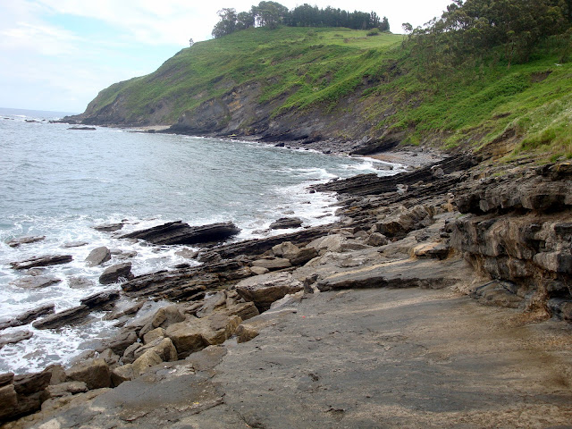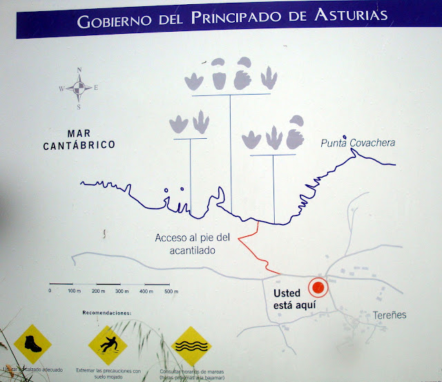 Prados; ganado vacuno pastando en ellos. Al sur, los perfiles de la Cordillera. Tras unos kilómetros la ruta desciende. Vemos otros horizontes precipitarse hacia el mar. Estamos llegando al cruce con la carretera en las cercanías a Tereñes. Un cartel anuncia que allí se come. Una parada técnica por lluvia aconsejó un café. En el minimalista ambiente del establecimiento se nos aconsejó asimismo tener mucho cuidado al descender al acantilado donde se aprecian diversas huellas de dinosaurios. Cuando descendíamos por una endiablada senda, los resbalones de la simple hierba nos hicieron recordar aquellos sabios consejos. Llegados al inicio del acantilado, una escala metálica sirve de mirador privilegiado. El siguiente paso es sobre la empinada roca, que esta mañana luce espléndidamente reluciente a causa de la lluvia. En ese paso, la suela de mi bota de montaña resbaló justo lo que me costó asirme a la barra salvadora. Así pues, solamente pudimos ver una de las icnitas, en este caso de un ejemplar grande de terópodo, es decir, del grupo de carnívoros sobre dos patas conocidos como Tiranosaurios. Cuestión de prudencia de andarín veterano