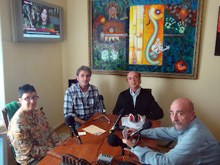 Ayer, 1 de octubre, el estudió se llenó con los tres invitados, por un lado, los artistas plásticos Carmen Casas y Juan Carlos Laporta que acababan de desmontar su exposición en el Espacio Adolfo Dominguez. Por el otro, el ínclito Dioniso Sanchez, director de la revista El Pollo Urbano, y creador del grupo teatral El Grifo. La apabullante figura intelectual de este eterno transgresor dio como resultado una deliciosa entrevista, trufada de anécdotas y vivencias que sólo Dionisio maneja de forma tan peculiar y nos hizo pasar un rato inolvidable.